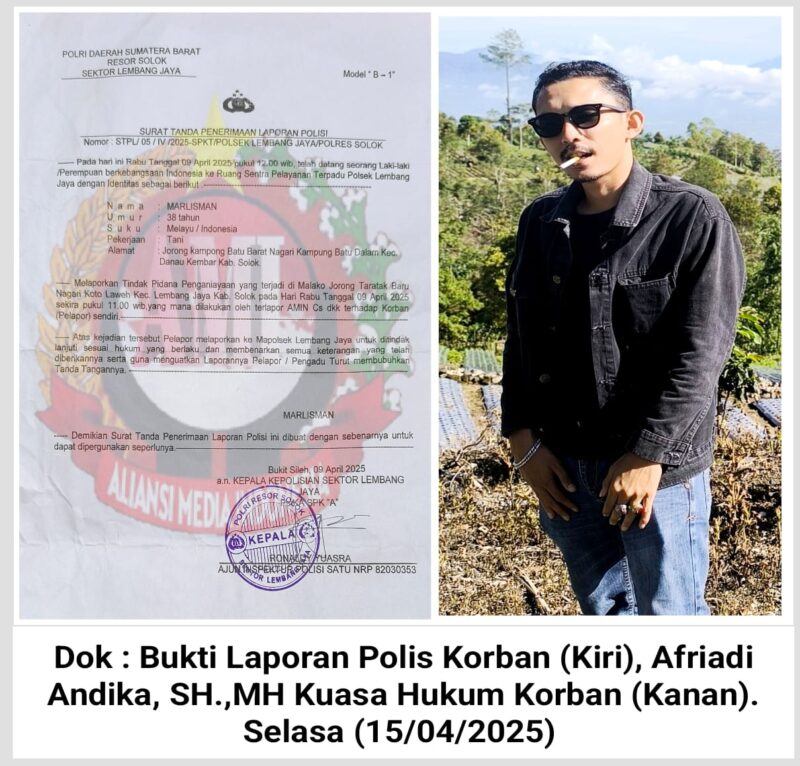 Dugaan tersebut telah di laporkan ke Polsek Lembang Jaya Kabupaten Solok, berdasarkan Laporan Polisi (LP) dengan nomor bukti laporan Model B-1 bernomor : STPL/05/IV/2025-SPKT/POLSEK LEMBANG JAYA/POLRES SOLOK pada Rabu tertanggal 09 April 2025 yang ditanda tangani oleh Ajun Inspektur Polisi Satu Ronaldy Yuasra SPK “A”