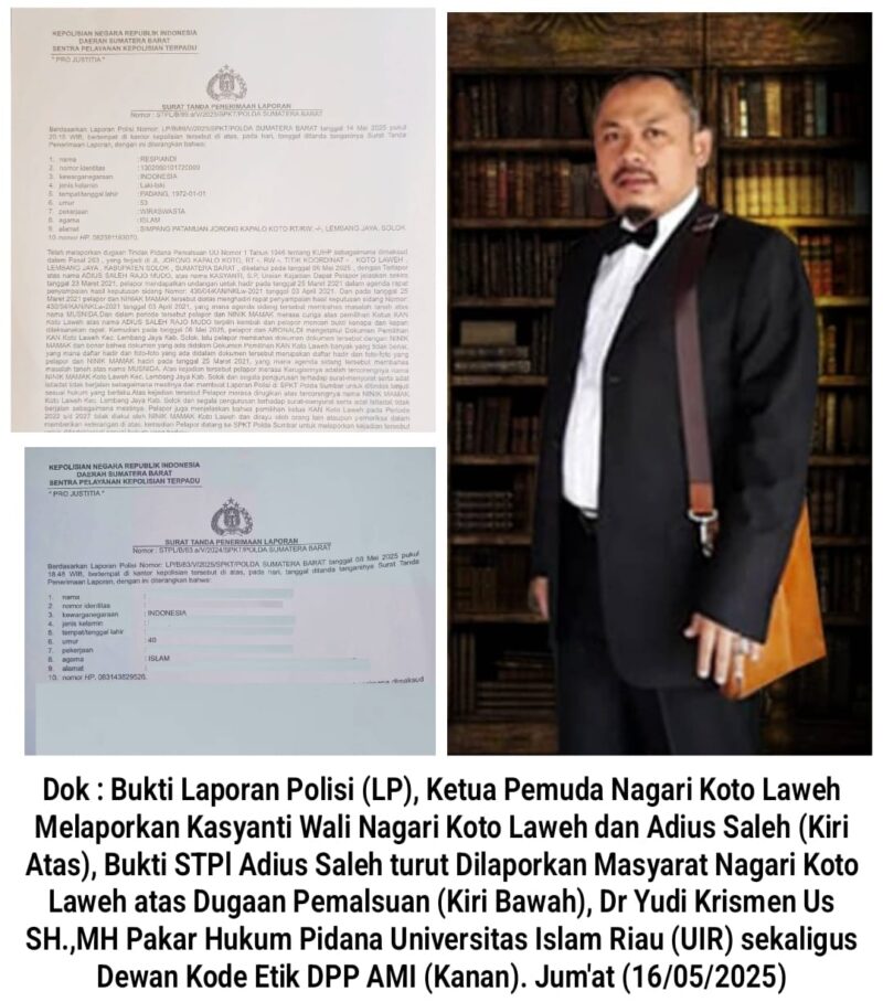 PADANG —– Setelah Adius Saleh oknum yang mengaku sebagai Ketua Kerapatan Adat Nagari (KAN) dan Kasyanti,SP Wali Nagari dilaporkan atas dugaan Pemalsuan Dokumen dan/atau Data oleh Refiandi Rajo Bangkeh Ketua Pemuda Nagari koto Laweh di Polda Sumbar. pada Rabu (14/05/2025)