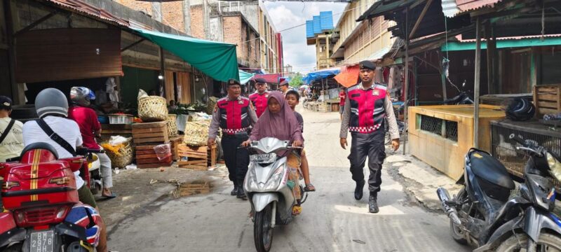 DUMAI | Polres Dumai, Polda Riau, melaksanakan patroli jalan kaki ke Pasar Pulau Payung. Patroli dialogis ini dilaksanakan dalam rangka memastikan kegiatan pedagang aman dari aksi premanisme.