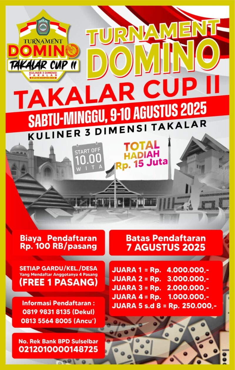 Takalar – Semangat kemerdekaan Republik Indonesia ke-80 tahun ini disambut dengan penuh antusiasme oleh masyarakat Kabupaten Takalar, Sulawesi Selatan. Salah satu kegiatan yang mencuri perhatian menjelang peringatan HUT RI adalah turnamen domino yang akan digelar di area Wisata Kuliner 3 Dimensi, Takalar, pada 9 hingga 10 Agustus 2025 mendatang.