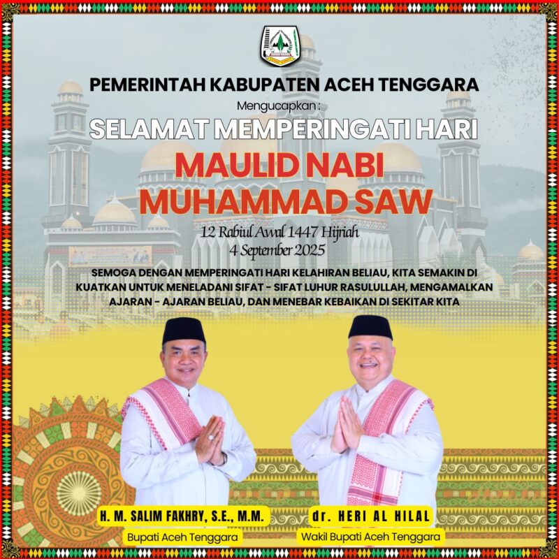 Aceh Tenggara – Pemerintah Kabupaten Aceh Tenggara mengajak seluruh warganya untuk menjadikan momentum Maulid Nabi Muhammad SAW sebagai sarana memperkuat keteladanan serta memperdalam nilai-nilai ajaran Islam dalam kehidupan sehari-hari. Ajakan tersebut disampaikan dalam bentuk ucapan resmi pemerintah daerah yang dirilis pada peringatan Maulid Nabi, 12 Rabiul Awal 1447 Hijriah atau bertepatan dengan 4 September 2025.