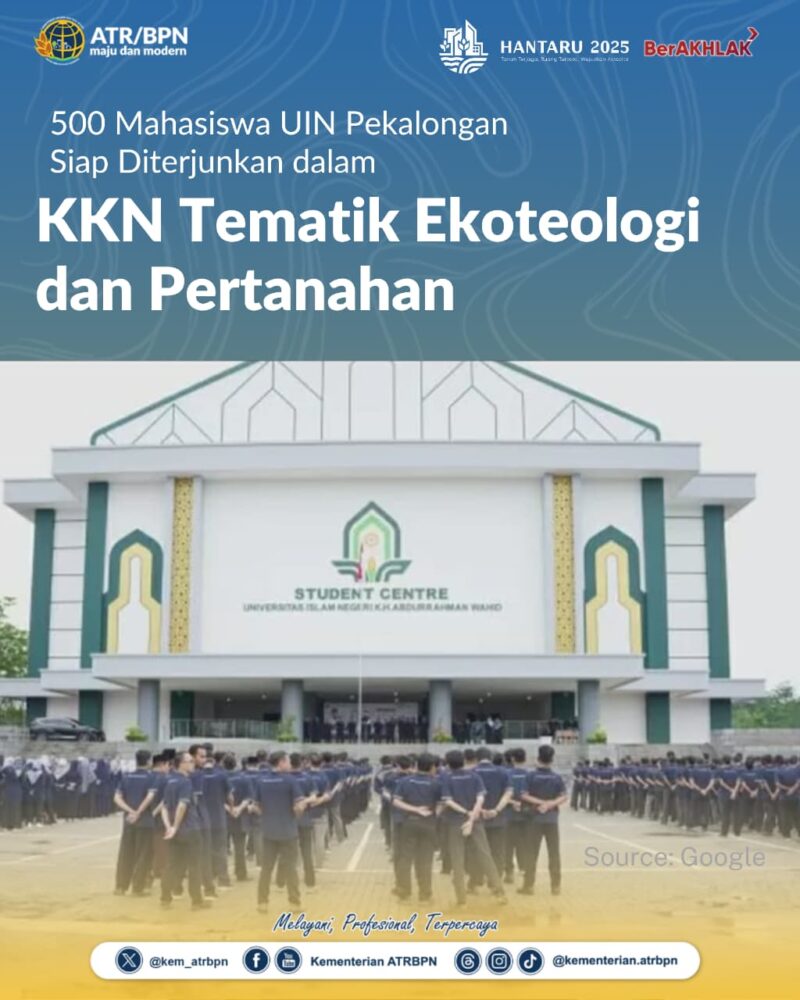 Pekalongan – Sebanyak 500 mahasiswa Universitas Islam Negeri (UIN) K.H. Abdurrahman Wahid Pekalongan bersiap mengikuti Kuliah Kerja Nyata (KKN) Tematik Ekoteologi dan Pertanahan, yang secara resmi akan diterjunkan ke lapangan pada Senin (13/10/2025). Kegiatan ini merupakan hasil kolaborasi antara Kementerian Agraria dan Tata Ruang/Badan Pertanahan Nasional (ATR/BPN), Kementerian Agama, dan UIN K.H. Abdurrahman Wahid Pekalongan.