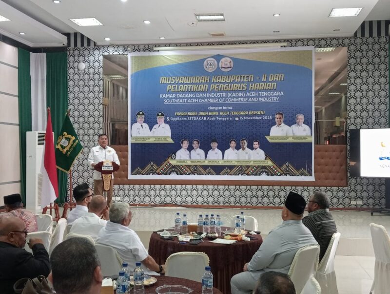 Kutacane — Bupati Aceh Tenggara, H. M. Salim Fakhry, didampingi Wakil Bupati H. Al Hilal, secara resmi membuka Musyawarah Kabupaten (Muskab) ke-II Kamar Dagang dan Industri (Kadin) Aceh Tenggara yang berlangsung di Oproom Setdakab, Sabtu (15/11/2025).