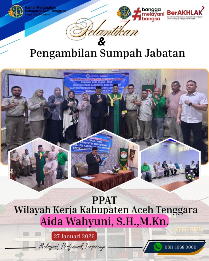 Kantor Pertanahan Kabupaten Aceh Tenggara melaksanakan kegiatan Pengambilan Sumpah Jabatan dan Pelantikan Pejabat Pembuat Akta Tanah (PPAT) pada Selasa, 27 Januari 2026, bertempat di Aula Kantor Pertanahan Kabupaten Aceh Tenggara.