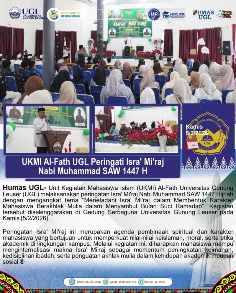 Kamis 5 februari 2026 tepatnya di gedung aula serbaguna komplek universitas gunung Leuser.ukmi melaksanakan isra mi’raj nabi Muhammad Saw 1447 Hijriah dengan mengangkat tema “Meneladani Isra’ Mi’raj dalam Membentuk Karakter Mahasiswa Berakhlak Mulia dalam Menyambut Bulan Suci Ramadan”. Kegiatan tersebut diselenggarakan di Gedung Serbaguna Universitas Gunung Leuser pada Kamis (5/2/2026).