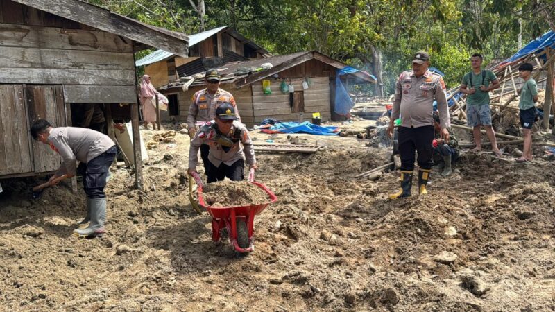 Dengan peralatan seadanya, personel kepolisian bersama warga membersihkan lumpur, sampah, serta sisa material banjir yang masih menumpuk di dalam dan sekitar rumah warga. Kegiatan ini dilakukan untuk membantu mempercepat pemulihan lingkungan dan memungkinkan warga kembali menempati rumah mereka dengan lebih layak.
