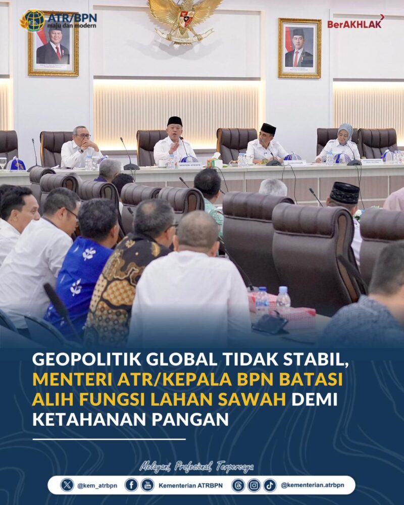 Palu – Di tengah kondisi geopolitik global yang tidak stabil, Menteri Agraria dan Tata Ruang/Kepala Badan Pertanahan Nasional (ATR/BPN), Nusron Wahid, menegaskan bahwa ketahanan pangan menjadi prioritas nasional. Oleh karena itu, Kementerian ATR/BPN menerapkan pembatasan alih fungsi lahan sawah maksimal hanya 11% dari total Lahan Baku Sawah (LBS), sementara sekitar 89% sisanya wajib dilindungi.